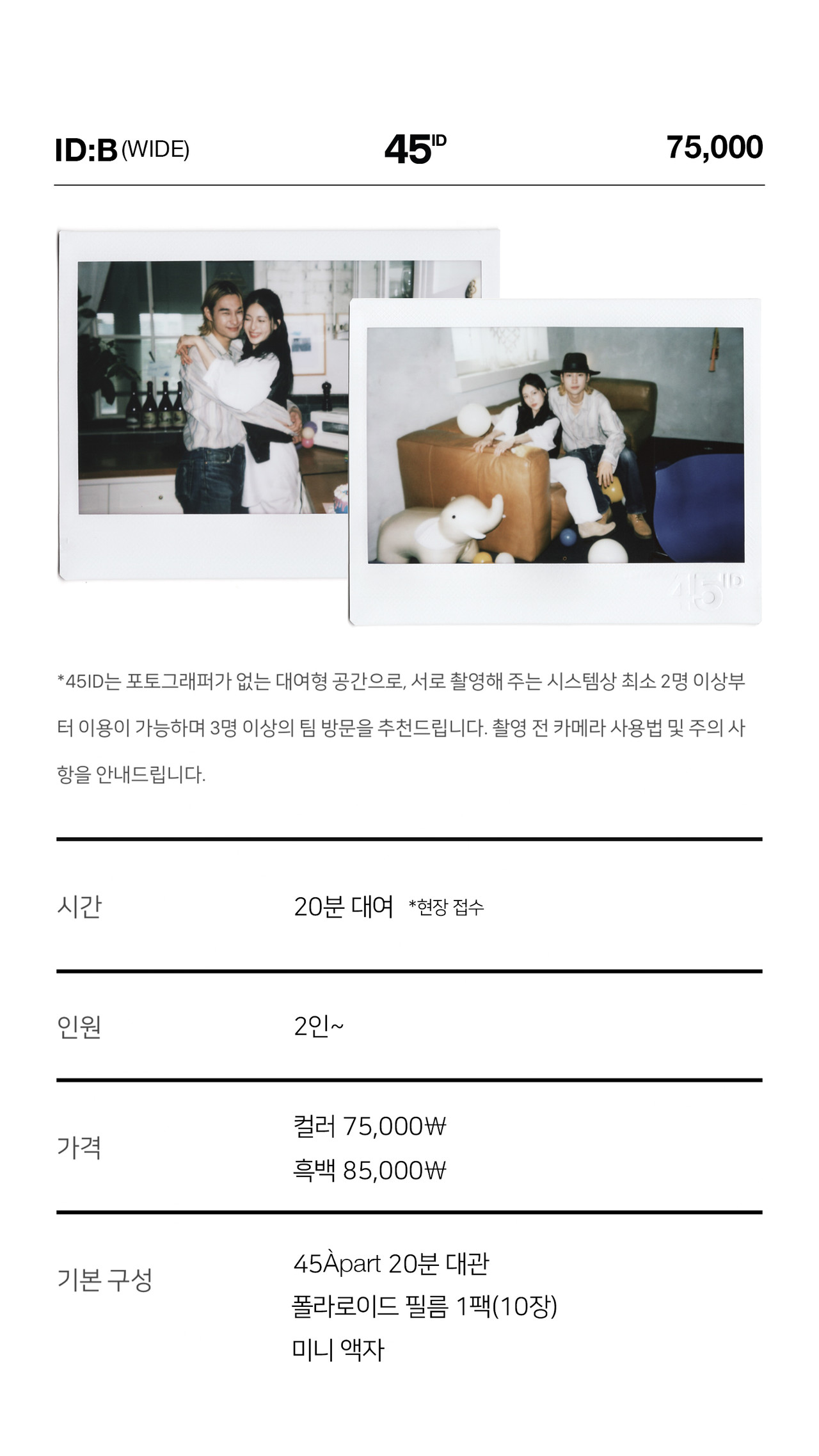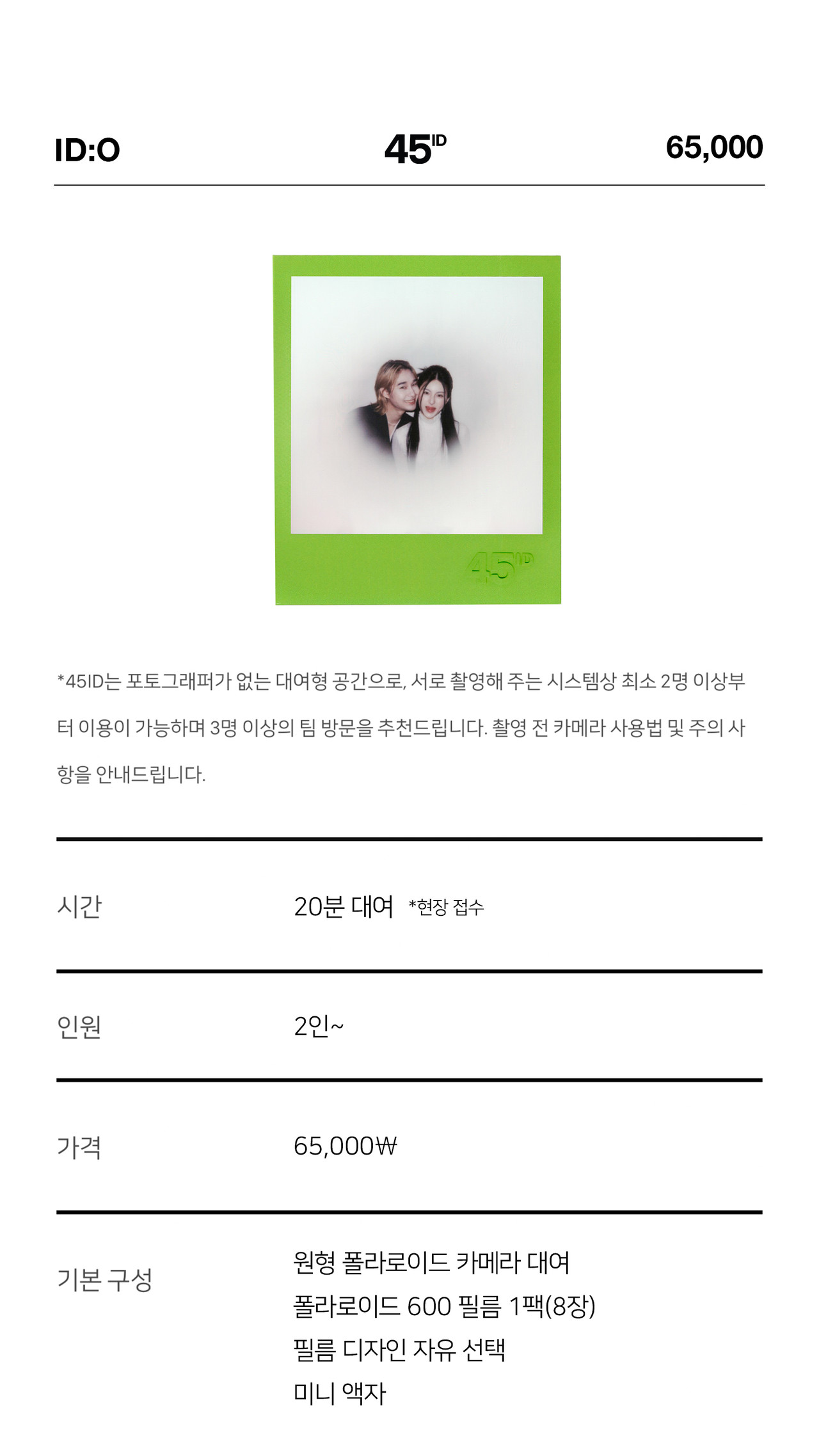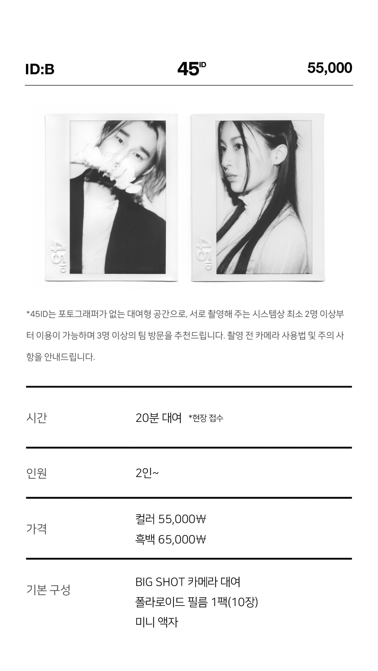 *45ID 공간 내부에서 폴라로이드를 간단하게 체험해 보기 위한 상품입니다. 프라이빗하고 다양한 폴라로이드 촬영을 원하시는 분들은 ID:P/W/C 촬영 예약을 추천드립니다.